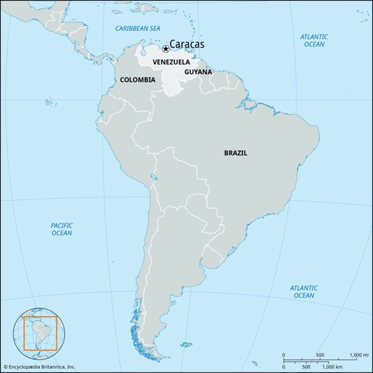 - Political features of Venezuela include its location at the northern end of South America, with land boundaries with Guyana to the east, Brazil to the south, and Colombia to the west, as well as maritime boundaries with the Caribbean Sea and Atlantic Ocean.