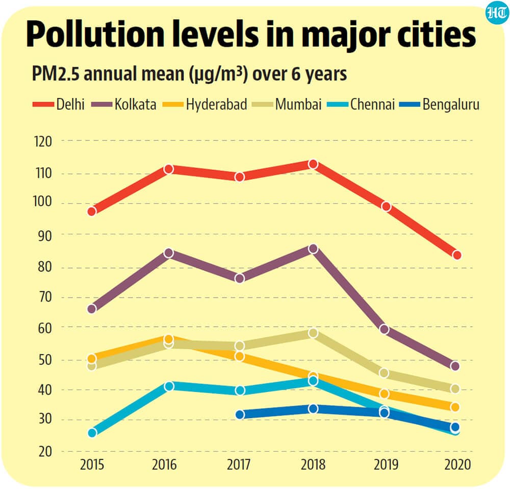 - Indian cities New Delhi, Kolkata, Mumbai and, Hyderabad have the highest PM2.5 levels ranging between at 40-81 μg/m3 against the WHO prescribed PM2.5 levels of 10 μg/m3 (CHE, 2017).