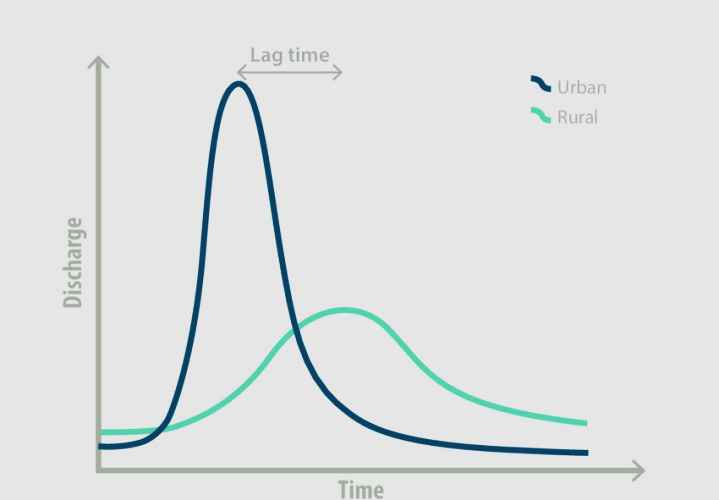 - Built environment, Paved streets and roads: reduce infiltration of rainwater significantly and increases surface runoff considerably