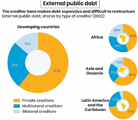 • Challenges of Reliance on Private Creditors: Dependence on private creditors brings issues in debt restructuring and higher volatility during crises. These loans are also costlier than concessional financing from multilateral or bilateral sources.