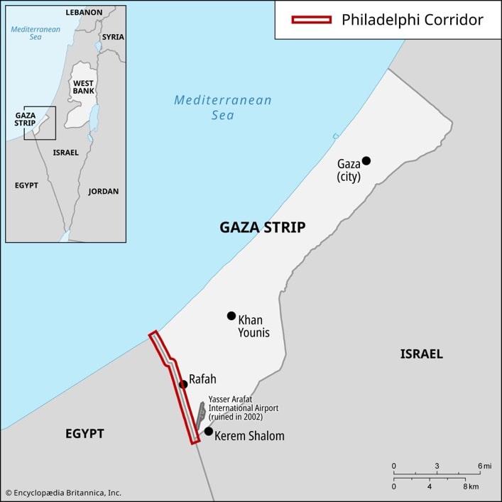 - फिलाडेल्फिया गलियारा भूमि की एक पट्टी है जो गाजा-मिस्र सीमा के साथ नौ मील लंबी और 100 मीटर चौड़ी है, जिसमें राफा क्रॉसिंग शामिल है।