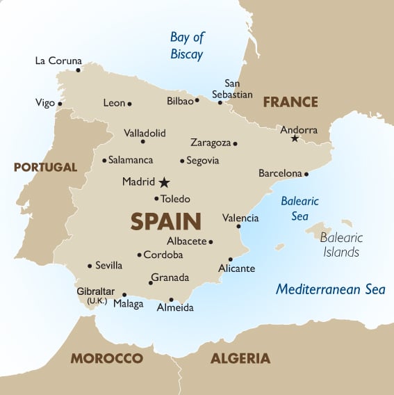 - पुर्तगाल, अंडोरा, फ्रांस और जिब्राल्टर के साथ भूमि सीमाएँ।
