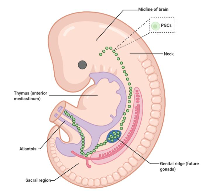 • Migration: PGCs migrate through the hindgut and dorsal mesentery, eventually colonizing the genital ridges, where they undergo mitotic proliferation.