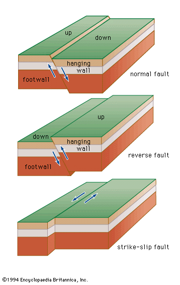 - Strike-slip fault: Shear dominates; σ2 vertical.