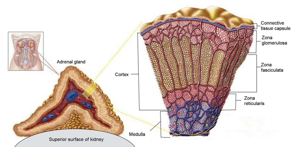 A transverse section shows the adrenal gland with two distinct regions: