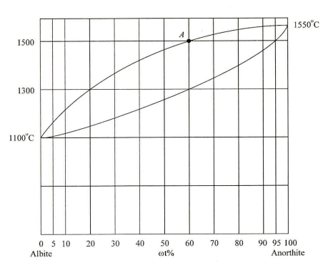 Geology 2a In the given Albite-Anorthite phase-diagram liquid of A composition begins to crystallize at 1500°C. What would be the composition of first crystallized feldspar? What would be the composition of liquid and solid at the last stage of crystallization under equilibrium condition? If the equilibrium between liquid and solid is not maintained, what texture of plagioclase is likely to result? (IFS 2017/10 Marks)