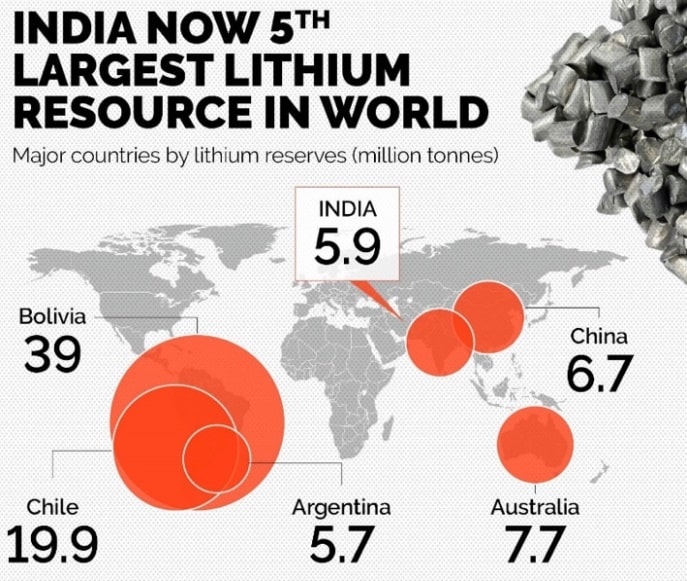 - भारतीय भूवैज्ञानिक सर्वेक्षण सक्रिय रूप से भारत के भीतर लिथियम भंडार की खोज कर रहा है।