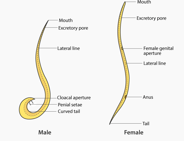 • Males are generally smaller and have a curved tail with spicules for copulation.